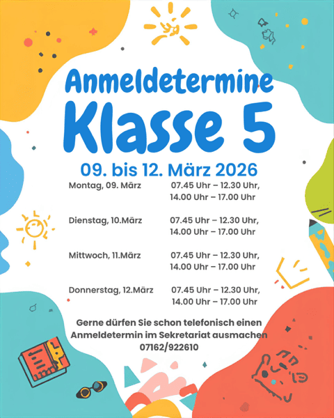 Die Anmeldetermine der zukünftigen Klassen 5 für das Schuljahr 2026/2027 finden wie folgt statt:
