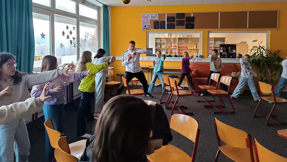 An vier Nachmittagen durften die Schüler:innen der AG „Gesund aufwachsen am Messelberg“ lernen, wie sie in Gefahrensituationen richtig handeln, wie sie sich gegenüber vermeintlich Stärkeren mit Worten wie „Halt, Stopp! Lass das!“ und den entsprechenden Körperhaltungen wehren können. Die Fünftklässler wissen nun, dass man helfen und nicht wegschauen soll, wenn andere Menschen gemobbt werden. Durch das Projekt RESPEKT haben die Kinder Selbstvertrauen und Stärke gewonnen. Auch die Sinnhaftigkeit des Handys wurde kritisch hinterfragt. Mit der Botschaft „Hört auf, dauernd auf dieses Ding zu schauen und fangt wieder an, miteinander zu reden!“ zeigte Eugen Keim deutlich die sozialen Defizite der heutigen Gesellschaft auf.