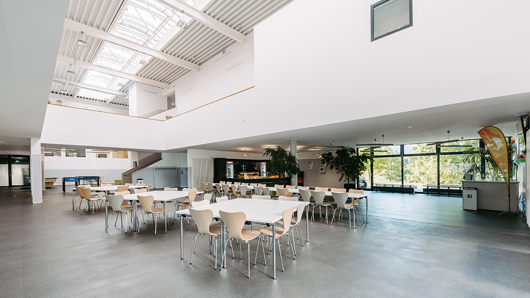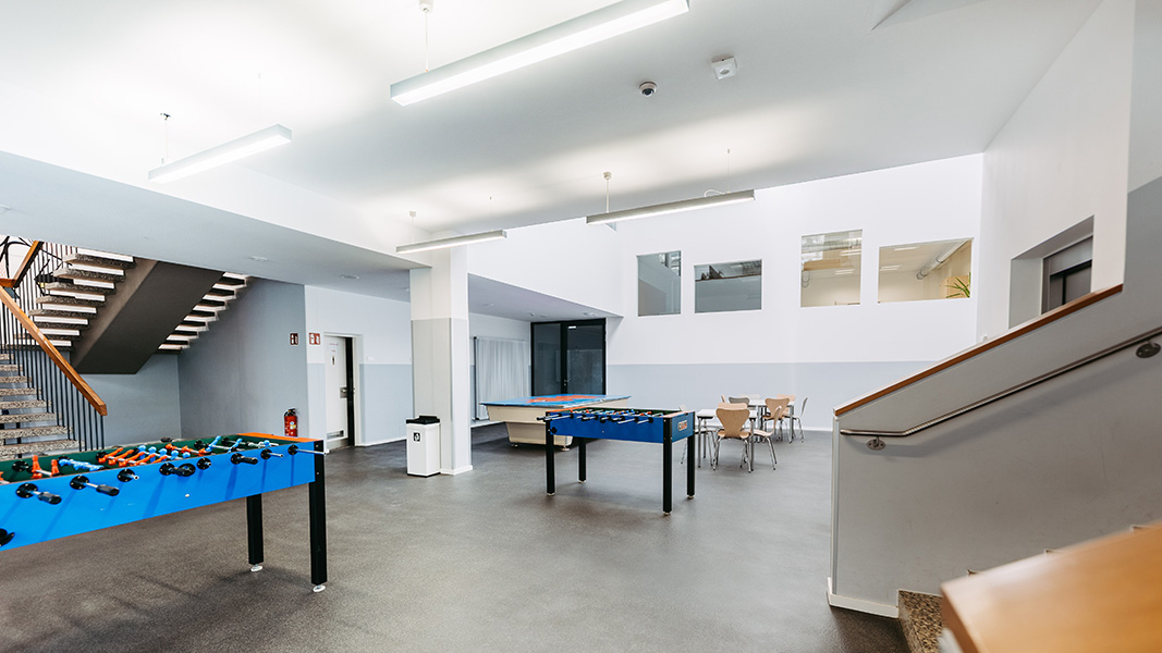 - Freizeitbereiche mit „Chill“- und Spielmöglichkeiten (Lounge-Bereich, Tischkicker, Billard, Darts etc…) in der Mensa sowie im Checkpoint (Jugendhaus)